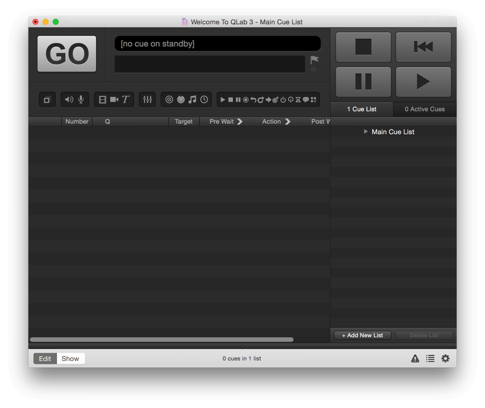 A new workspace will have one cue list named “Main Cue List.” You can change this name as needed. To add a new cue list, click the button at the bottom of the sidebar labeled + Add New List. To delete a cue list (and all the cues in it!), select the cue list you want to delete and click the Delete button, which relabels itself to match the name of the selected list.