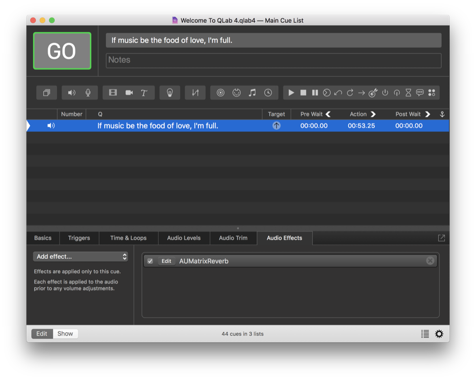 With a Pro Audio or Pro Bundle license installed, QLab can use AudioUnit effects installed on your Mac to process sound dynamically in realtime. For an AudioUnit to work in QLab, it must be 64-bit, must be defined as an effect (i.e. MIDI synthesizers won’t be available in QLab because they are generators, not effects), and must report a “tail time” (for example, a reverb’s decay time.)