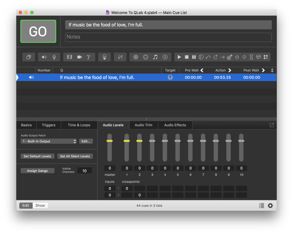 Audio cues allow you to play sound files with precise control over timing, levels, and routing. Audio cues must have a target, which is a sound file on your computer, and an output patch, which is a sound output destination such as your computers’ speakers, headphone jack, or an audio interface.