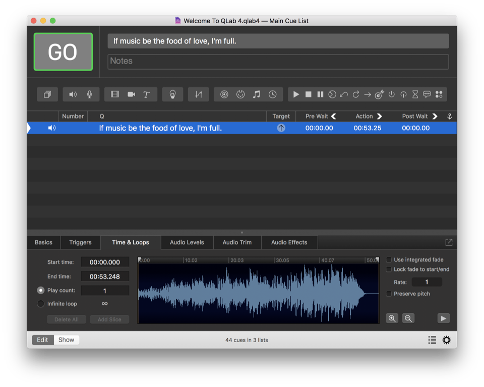 The Play count and Infinite loop options can loop the entire sound file, but QLab can also loop specific sections of the file. To do this, you create slices within the cue and set each slice to loop as needed.
