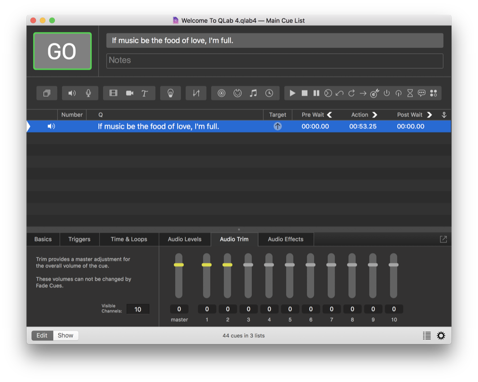 The trim tab is similar to trim on an audio mixer: it provides a master adjustment for the overall volume of the cue. These volumes can not be affected by Fade Cues.