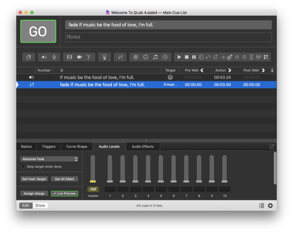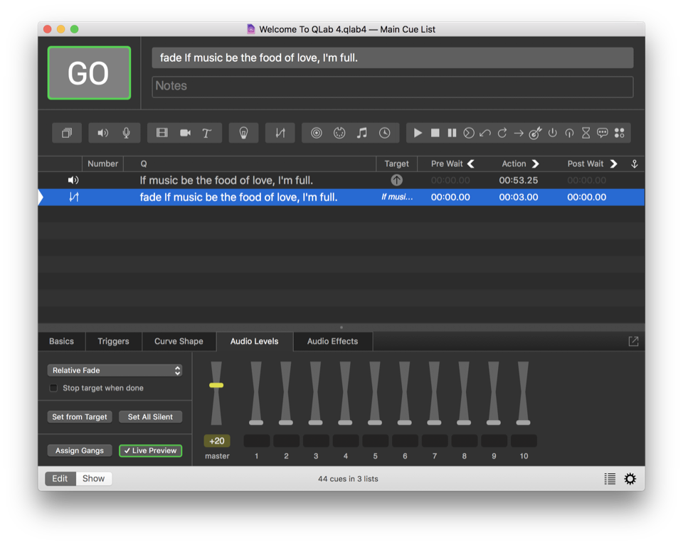 Be very careful with relative fades that raise levels. If, for example, you were to create a relative Fade cue to raise the level of an Audio cue from a very soft level, say -50, up to -10. You’d set the Audio cue to -50, then create a relative Fade cue with a level change of +40. If you accidentally ran that Fade cue twice, QLab would attempt to fade the Audio cue to +30, which is rather loud!
