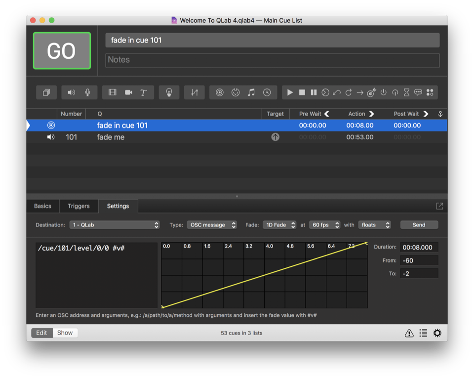 This option will allow you to set a starting value and ending value, and have QLab send a series of OSC messages interpolating between them. You need to give the Network cue a duration for this to work properly, and once you do you’ll be able to set the frequency with which messages are transmitted, and whether you want QLab to interpolate between the starting and ending values using floating point numbers (numbers with decimal values) or integers (whole numbers.)