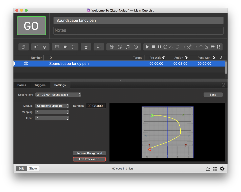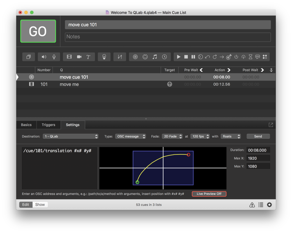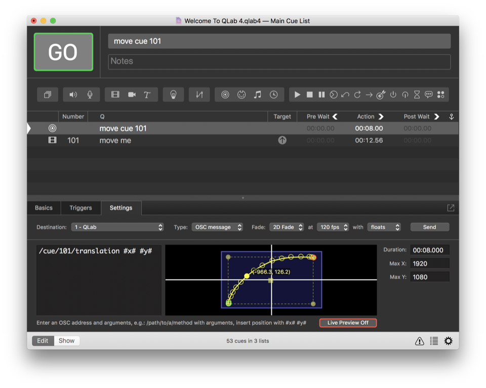 If the Live Preview button is set to On, QLab will transmit OSC messages as you click and drag so that you can see or hear the results in real time.