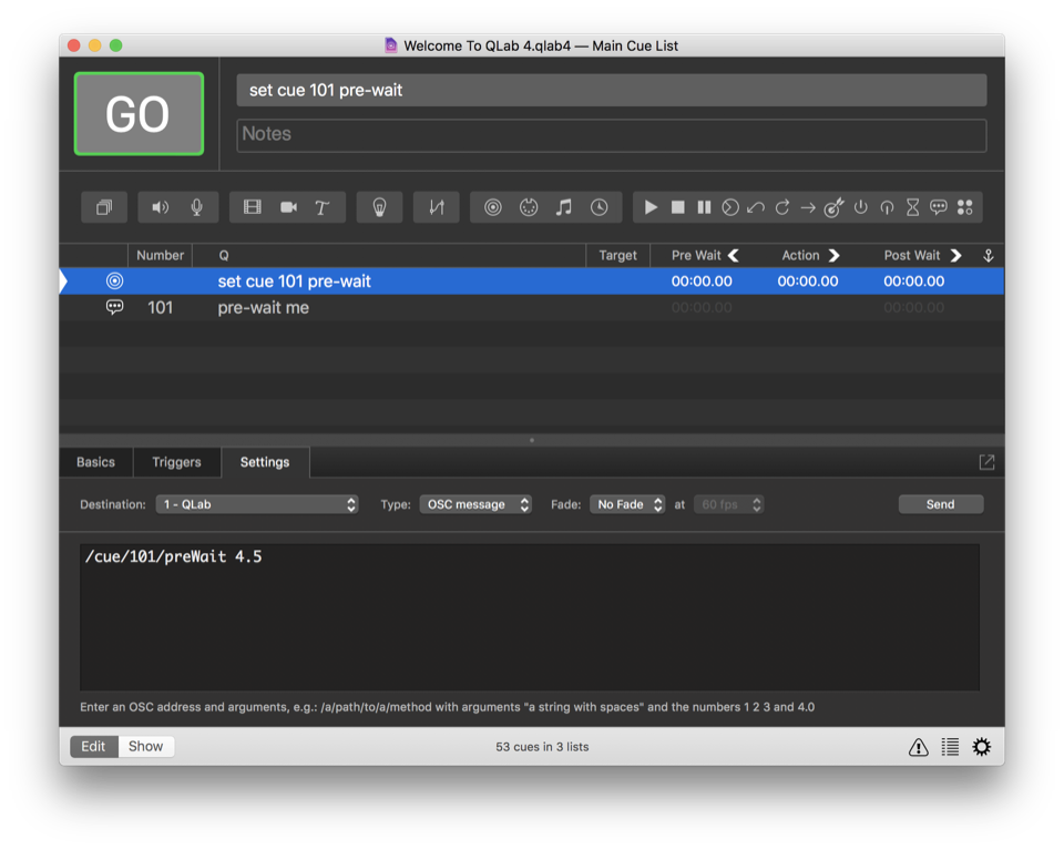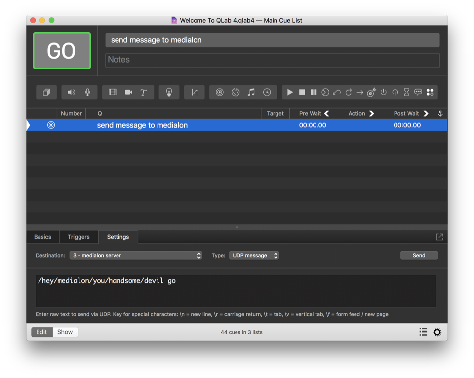 The text field allows to enter any single OSC command. For example, to tell a remote copy of QLab to GO, enter the command /go. Multiple arguments in a custom OSC message are separated by spaces, like this: