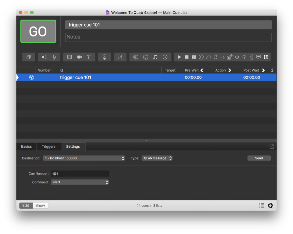 When using Network cues to communicate with another computer running QLab, or to send OSC messages from QLab back to itself, this option provides a very simple interface for accessing the commonly used OSC commands that QLab recognizes. Enter a cue number, and choose a command to send. Some commands have additional arguments, and additional fields will appear when those commands are chosen.