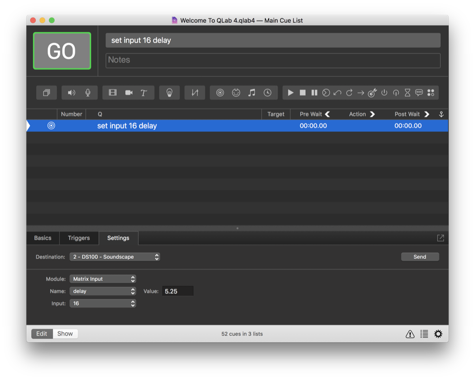 Destination. This drop-down menu shows the sixteen network patches, or destinations, to which QLab can send messages. You can edit this list in Network Settings. If the selected network patch is set to communicate with a Soundscape DS100, the rest of the Settings tab shows DS100-specific controls, described below.