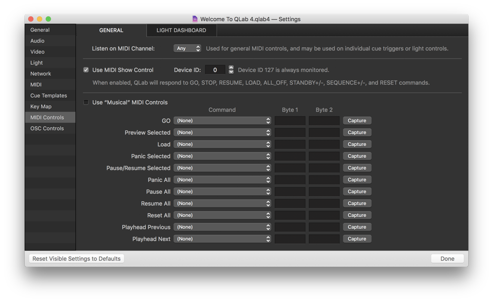 Once you’ve set the Device ID, there’s nothing else to configure in QLab. QLab will respond to the following MSC commands:
