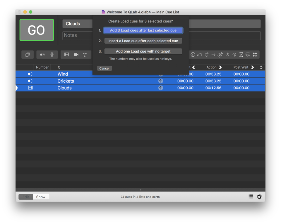 Additionally, starting with QLab 4.4, QLab behaves slightly differently when you create cues of any of these types depending upon what other cues are selected. When you create a new Fade, Start, Stop, Pause, Load, Reset, Devamp, GoTo, Target, Arm, or Disarm cue: