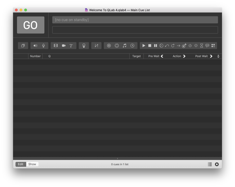 When you first open QLab, you’re presented with a new, fresh document. QLab documents are referred to as workspaces. A workspace contains one or more cue lists and/or carts which each contain cues.