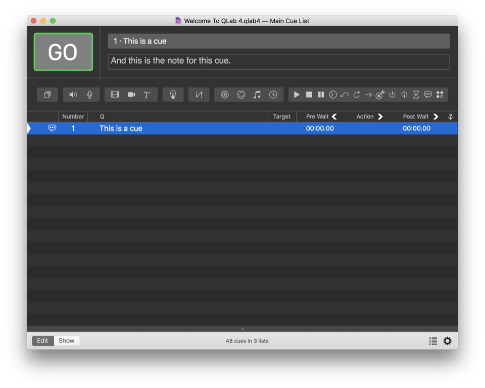 Beneath the toolbar is the cue list, which is the heart of your workspace. Cues are listed here in the order that they will play during your show, top to bottom. The columns in the cue list show essential information about each cue.