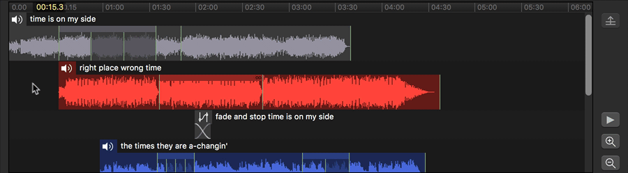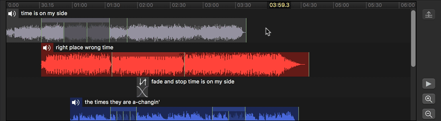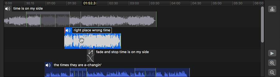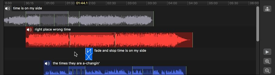 When the mouse is hovering over a cue, it will turn into a hand. Click and drag left or right to move the cue in the timeline, thus adjusting its pre-wait time. While a cue is being dragged, blue guidelines appear indicating the start and end of all the other cues in the Group, as well as any slices within those cues. The dragged cue will snap to these guidelines in order to make it easy to align cues with each other. If you want to focus on the guidelines belonging to only a single cue, drag over that cue’s “lane.” The guidelines for all other cues will be hidden, and you can then drag left or right as normal.