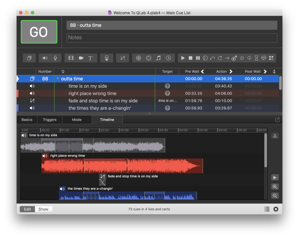 Starting with QLab 4.3, Groups set to start all children simultaneously have a Timeline tab in the inspector, which display the Group’s children in a visual timeline editor similar to the timeline found in many audio and video editing programs.