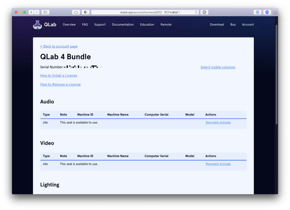 To do this, log into your QLab account at https://qlab.app/account and find the license you want to remotely deactivate listed under the heading Your Licenses.