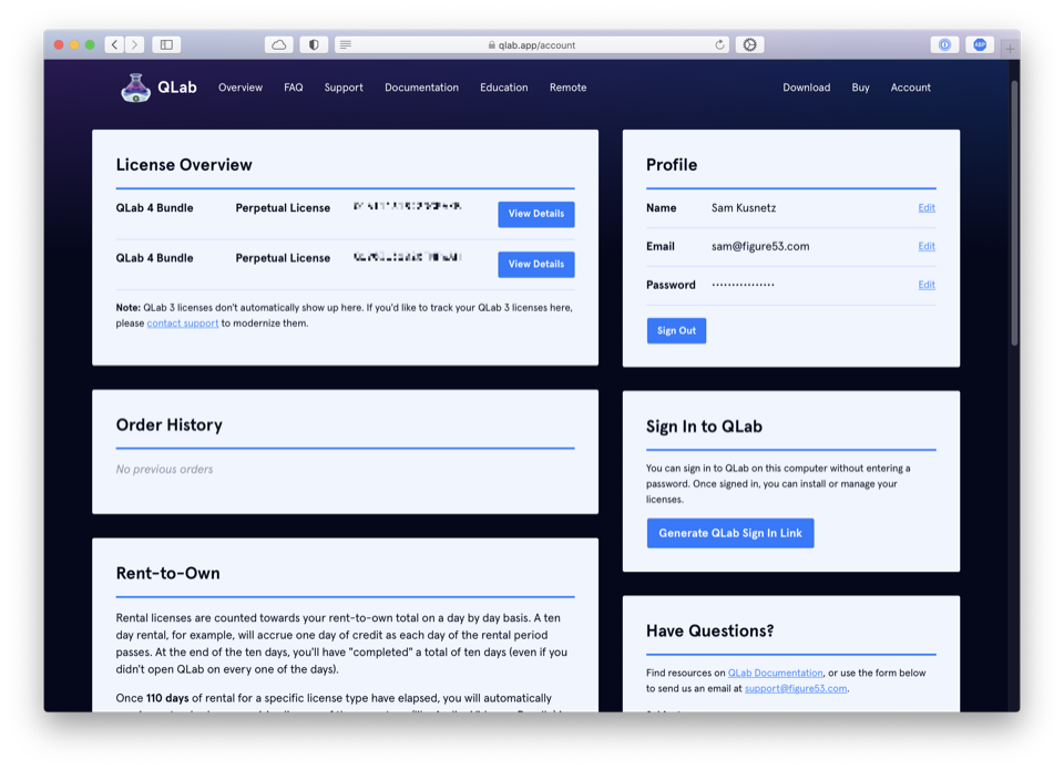 If you do not already have an account, completing the purchase will create an account for you, log you in, and prompt you to create a password for the account. You will use this password and your email address in QLab to install your licenses.