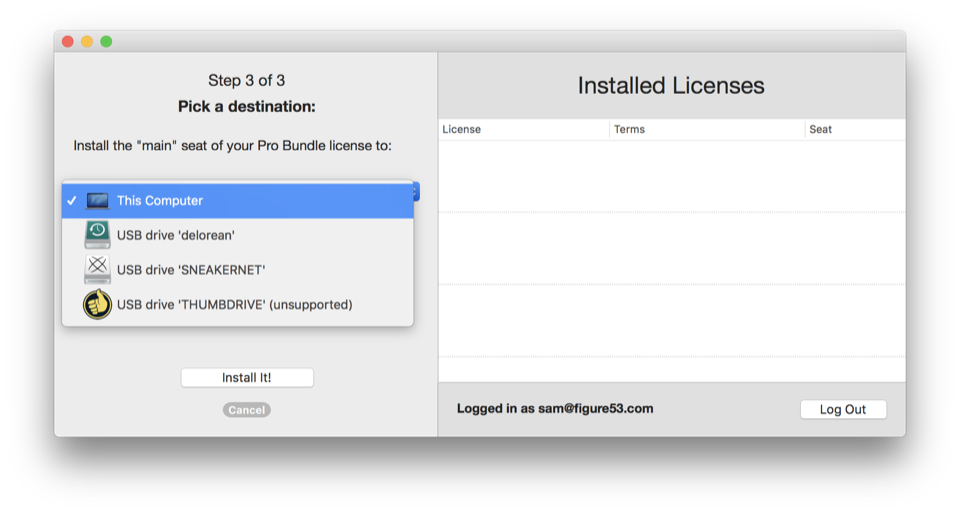 If you choose This Computer, the license seat will be installed onto your Mac, and will be accessible to all user accounts on that Mac. This is the most common way to install a license.