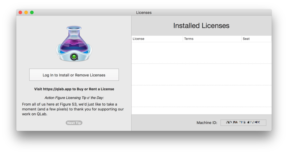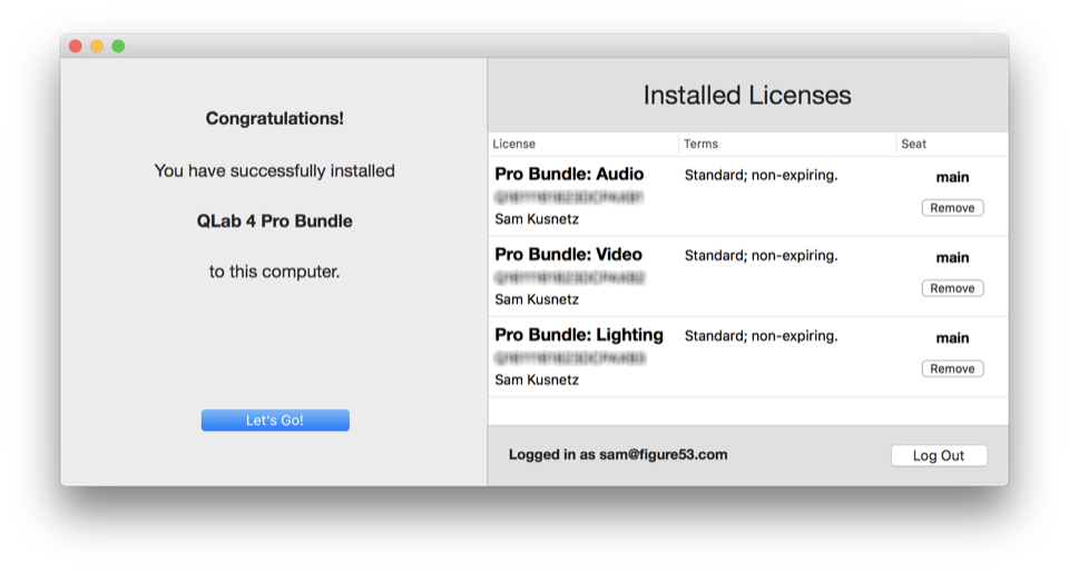 QLab 4 uses an account-based licensing system which allows you to install and remove licenses quickly and easily without having to keep track of license files. Licenses may also be installed on Mac which are not connected to the internet, and starting with QLab 4.1, licenses can also be installed onto a USB drive connected to your Mac.