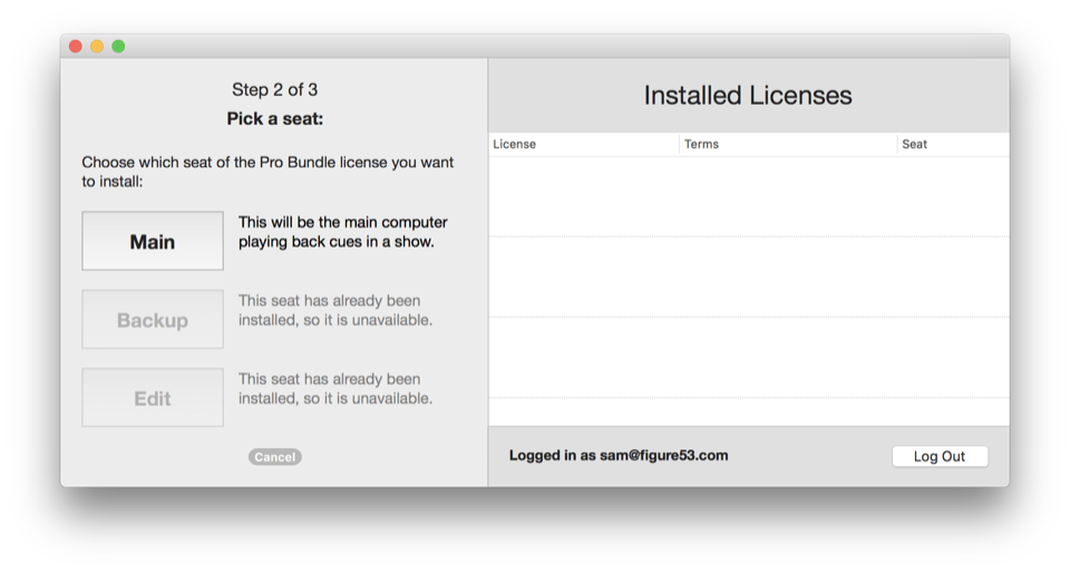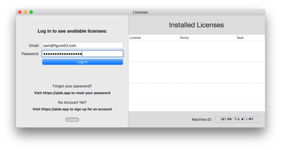 If you cannot or do not want to go through that process yourself, we are happy to do it for you. Copy the Machine ID of the Mac you want to use, send us an email at support@figure53.com. Paste in the Machine ID and tell us which license and which seat you want to install on this Mac. For example, you might say “I want to install the Main Audio seat of my Pro Bundle” or you might say “I want to install the Main Lighting and Backup Video seats of my Pro Bundle.”