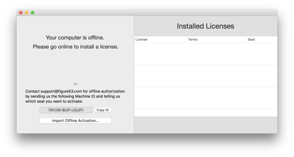 To perform a remote activation, you’ll need the Machine ID for the Mac that you want to use. When you open the License Manager on a Mac that’s not connected to the internet, it will look like this:
