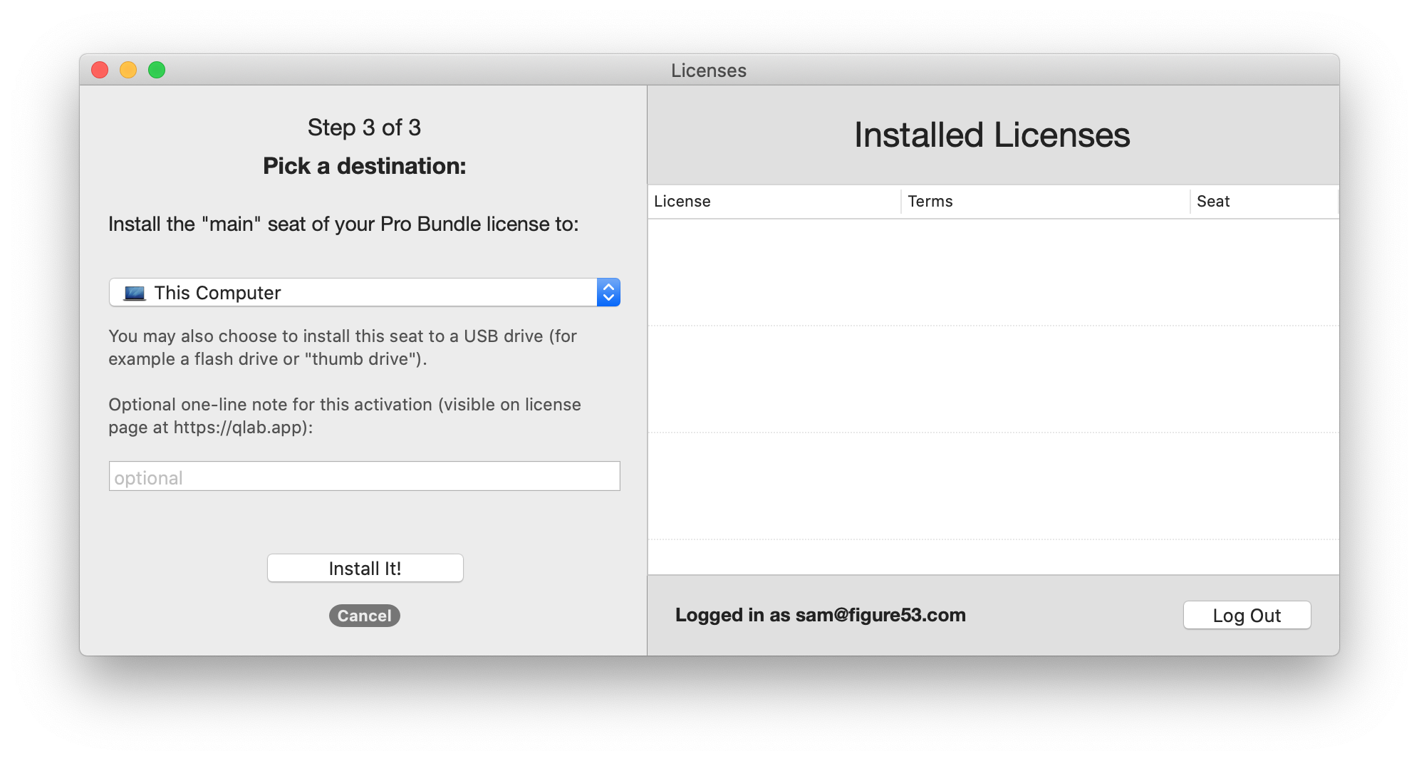 Starting with QLab 4.6.5, if you choose This Computer, you can optionally enter a single-line note to go along with the installation. This note can be seen when viewing the details your licenses on your account page on qlab.app.