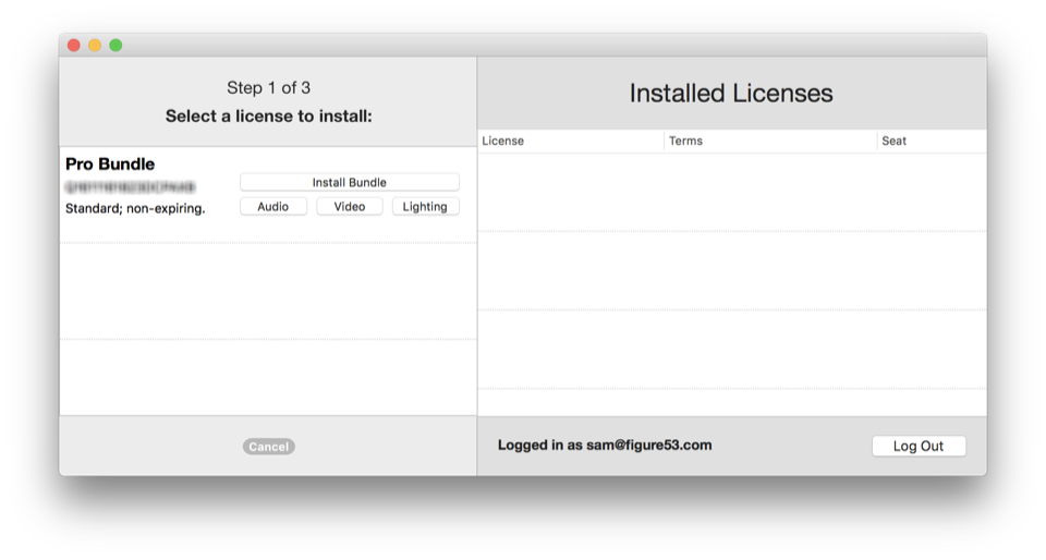 Click the Install… button to select the license for installation. Pro Bundle licenses may be installed all together, or you can individually install the Audio, Video, or Lighting portion of the license.