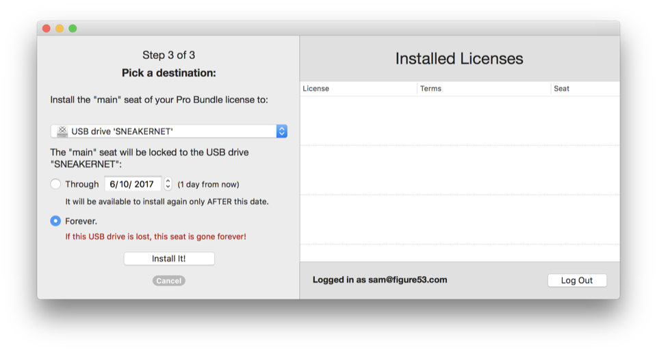 If you choose forever then your license seat will be permanently and irrevocably installed on the USB drive. This is dramatically different from installing a license seat onto a Mac, which can be un-done at any time.