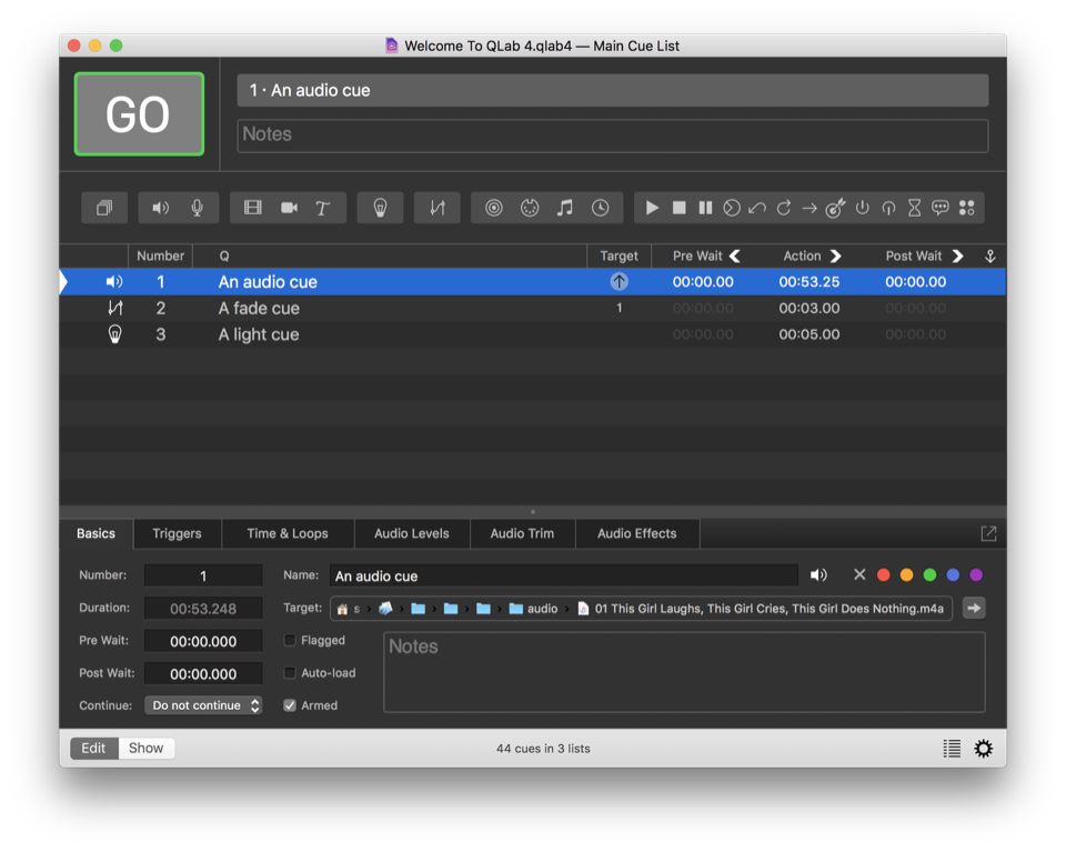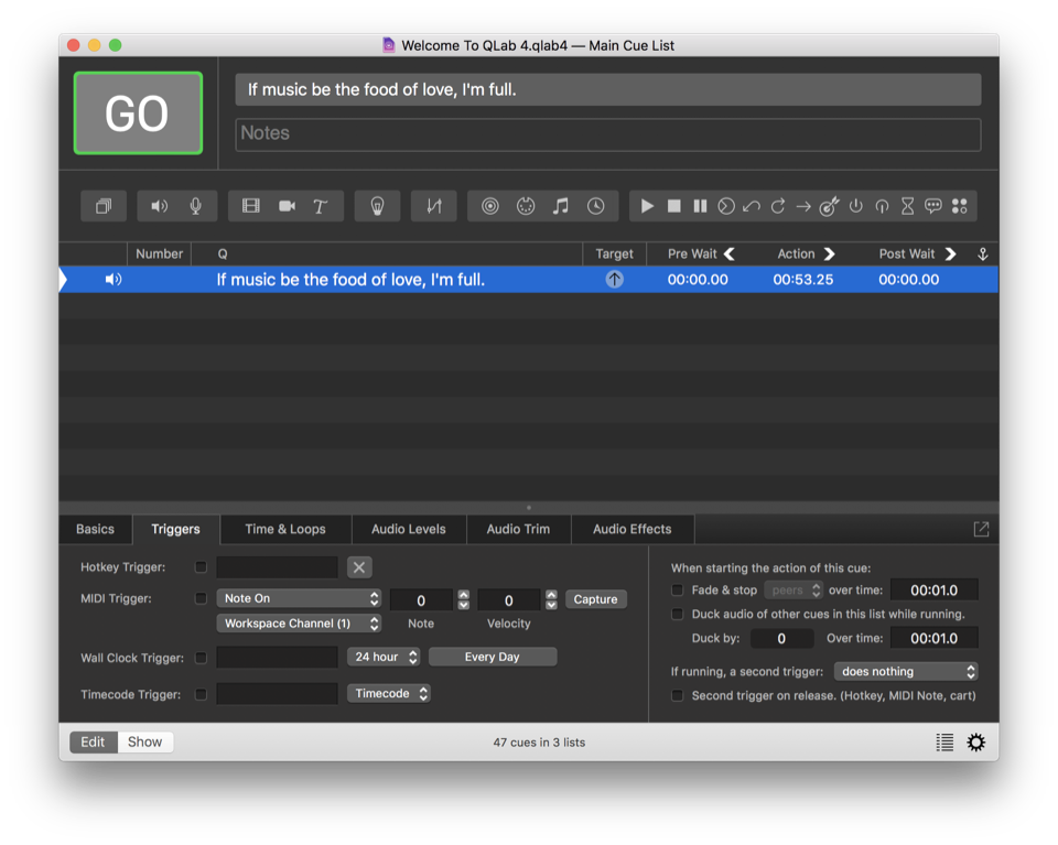 When a cue is given the signal to start, we say that the cue is triggered. The most straightforward way to trigger a cue is to press the GO button (or use the space bar) when the cue is standing by, but there are also several ways to directly trigger a cue even when it is not standing by.