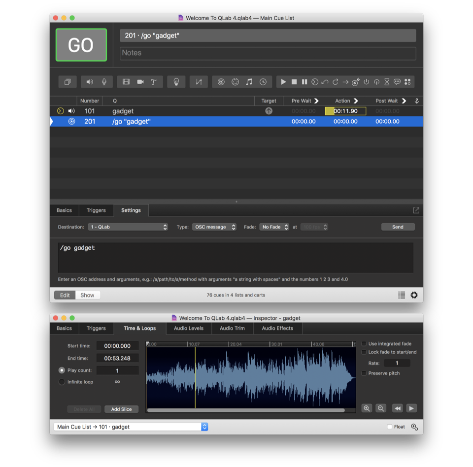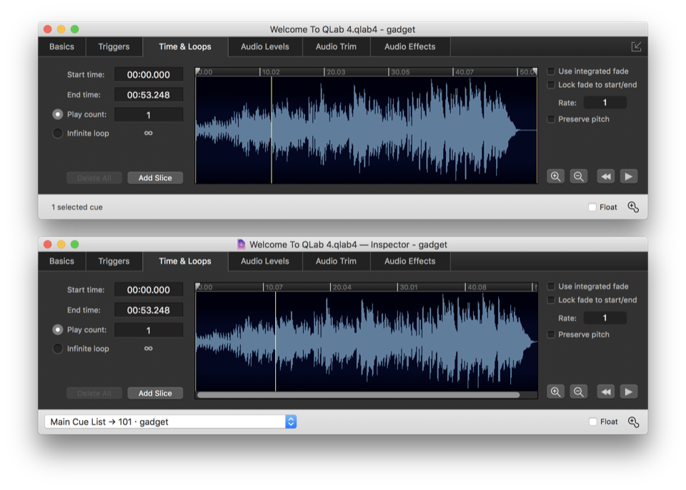In the screen shot above, the main inspector is showing properties of the selected cue, cue 201, and a secondary inspector has been opened which is showing the Time & Loops tab of cue 101.