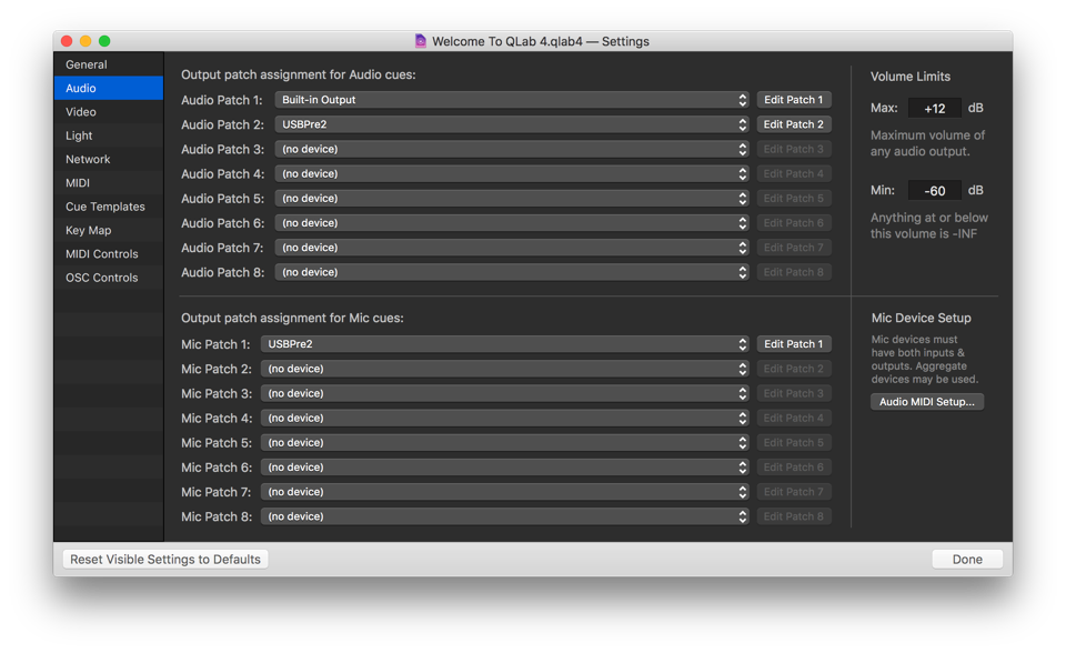Mic Device Setup. Output patches for Mic cues can only use audio devices which have both inputs and outputs, including aggregate audio devices. You can click the Audio MIDI Setup… button to open the Audio MIDI Setup application, which allows you to define aggregate audio devices and explore the details of the audio devices connected to your Mac.