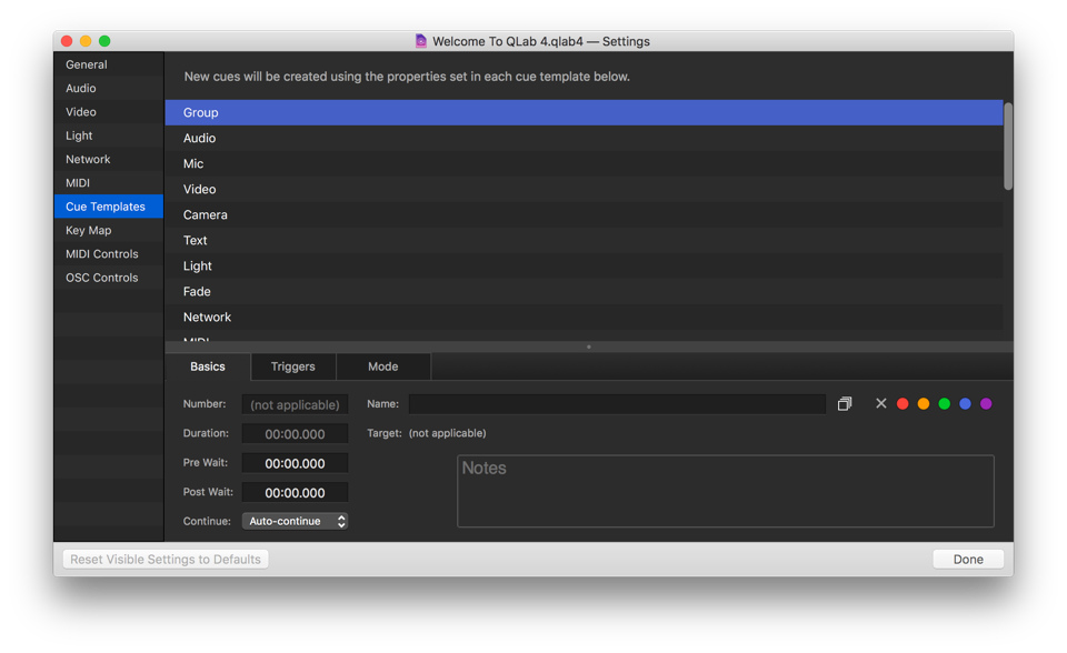 Cue Templates allow you to adjust the default settings of newly created cues. The Cue Templates section shows a list of all of the cue types in QLab and a copy of the Inspector below the list. You can select one of the cue types and use the Inspector to make any adjustments you like, including cue names, notes, targets… everything. Newly created cues will use these settings as their default.
