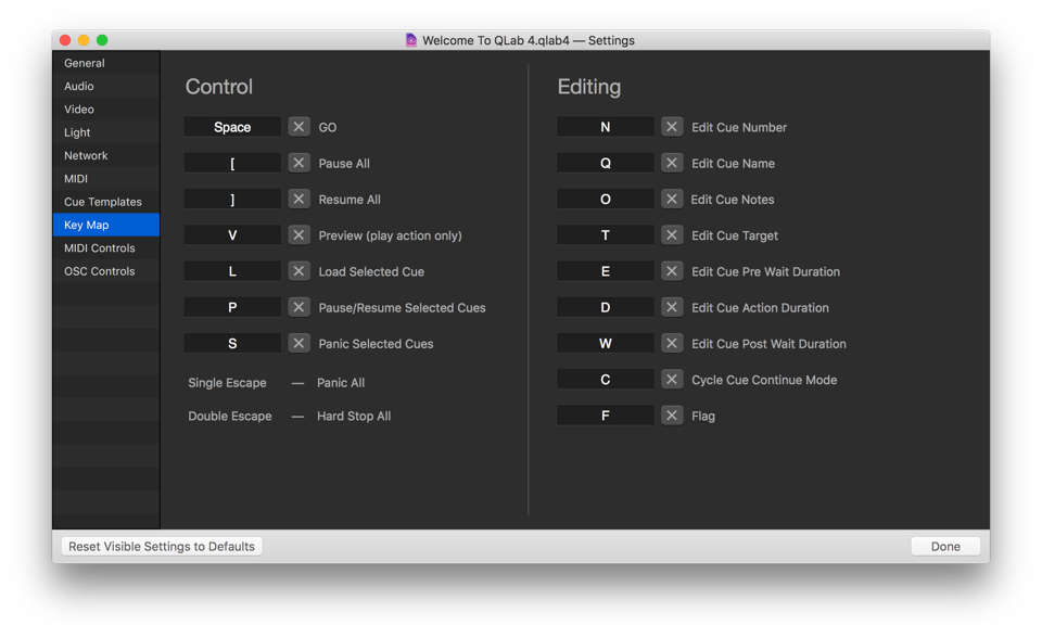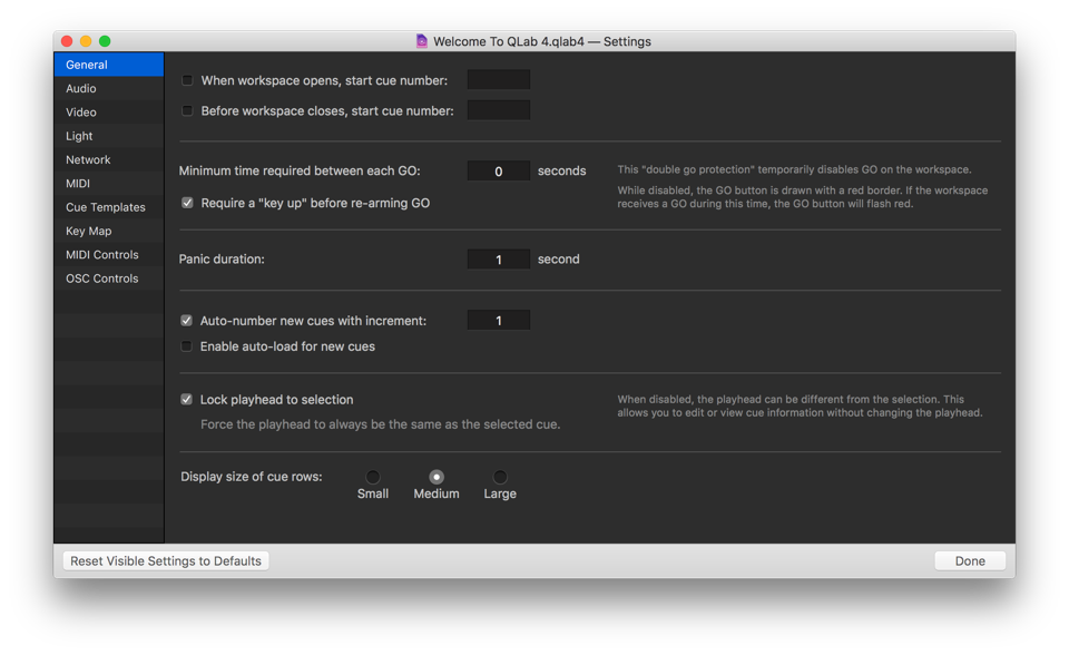 Settings in this window belong to the workspace, not to QLab, so they travel with the workspace if you bring it to another computer.