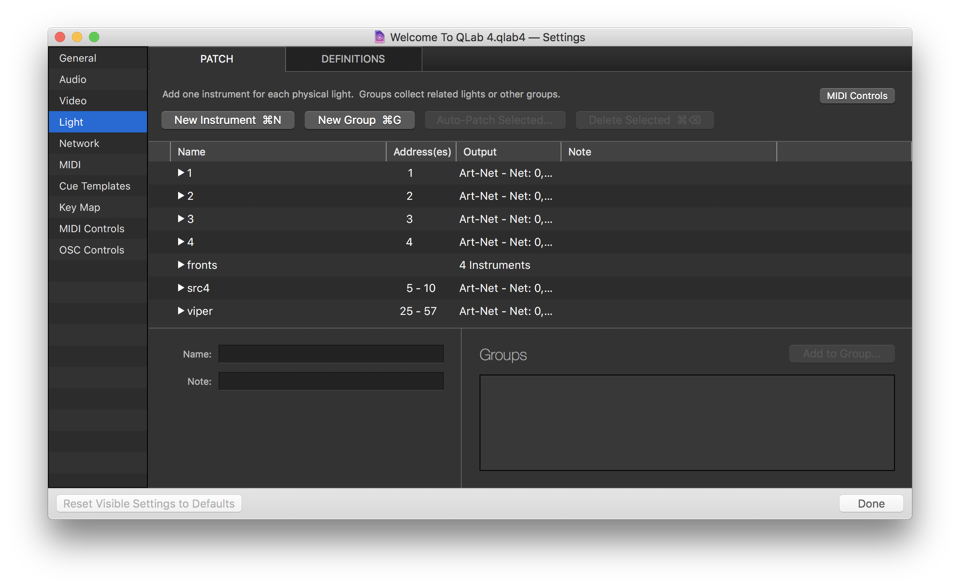 The Patch Tab allows you to view and edit the instruments and light groups in the workspace.