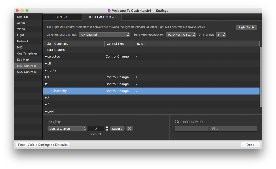 Command. For the listed transport controls, you can manually enter a MIDI command, or click “Capture” to have QLab listen for the next incoming MIDI command and assign that command to the selected control. Note that only Note On, Note Off, Control Change and Program Change messages can be used for transport controls.