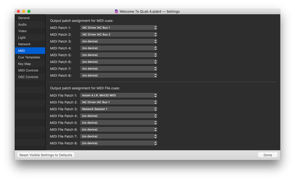 Output patch assignment for MIDI cues. MIDI cues can output to any of eight individual MIDI devices, which are assigned to one of eight MIDI Patches. Use the drop-down menus to assign a MIDI device to a patch. Note that these patches are only relevant to outgoing MIDI from MIDI cues, and have no bearing on incoming MIDI for triggers or workspace controls.