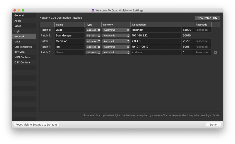 Network cues send OSC or UDP text messages to destinations which are configured in the Network section of Workspace Preferences. Starting with QLab 4.6, workspaces can have any number of destination patches. By default, new QLab workspaces start with a single patch, and you can add more by clicking the New Patch button or by using the keyboard shortcut ⌘N while this screen is frontmost.