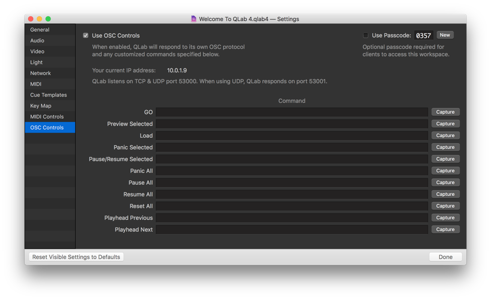 Command. For the listed transport controls, you can manually enter any valid OSC command, or click “Capture” to have QLab listen for the next incoming OSC command and assign that command to the selected control. Note that QLab’s own OSC commands for these controls are not overridden by entries here; they remain active in addition to them.