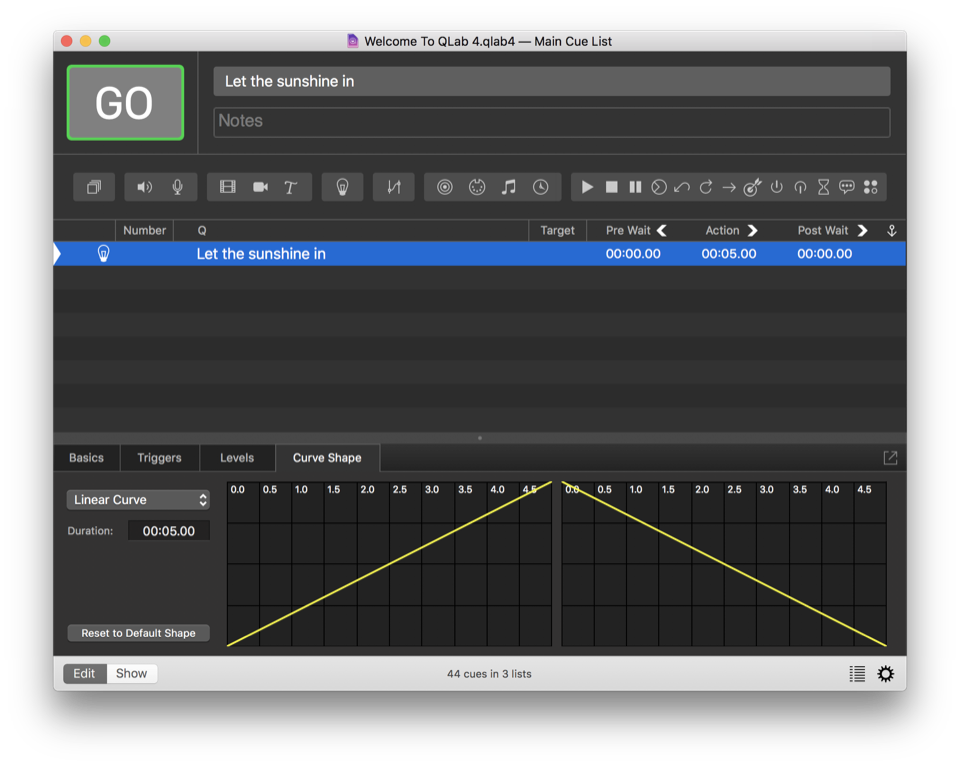 The curve shape determines the manner in which the parameter or parameters are adjusted over the course of the fade. QLab defaults to a linear curve, but any curve can be drawn in the Curve Shape tab by selecting Custom Curve from the drop-down menu in the top left corner of the tab.