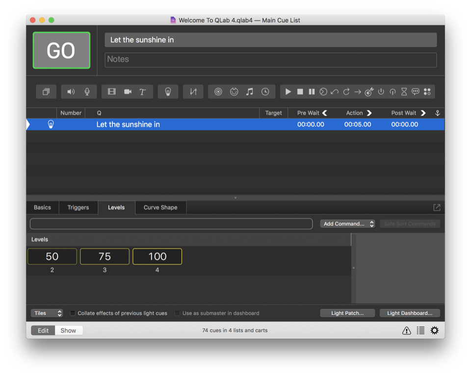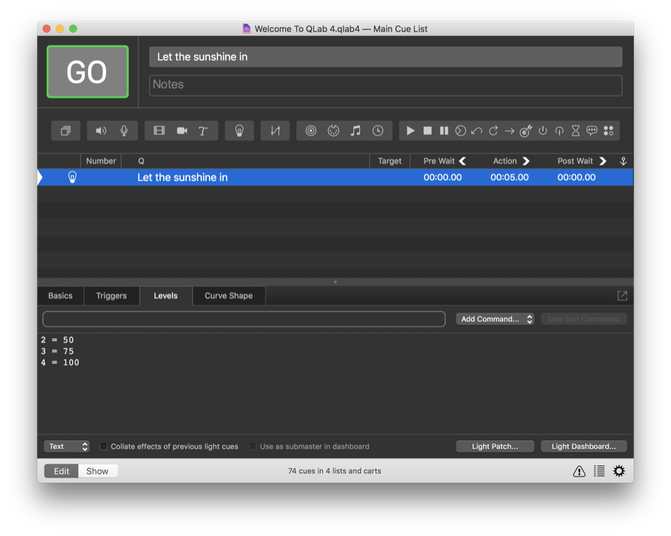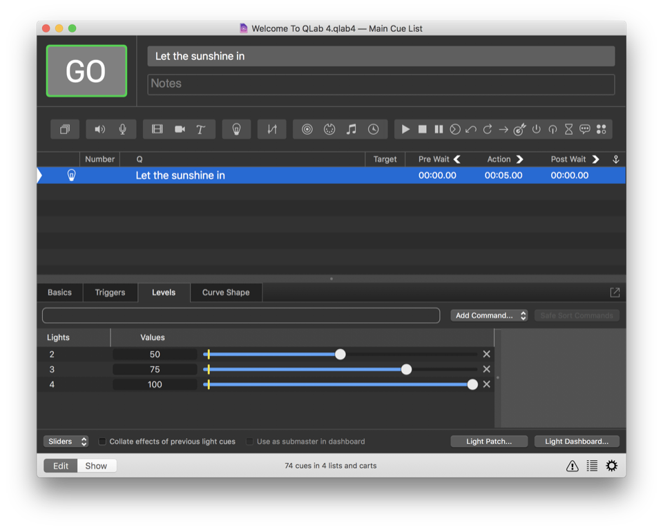 Commands can be dragged up and down in the list to re-order them. You can type in new values in the text fields, or drag the slider handles to change levels. Changes made in a Light cue will not be immediately reflected on stage; you need to run the Light cue in order to see those changes. In this way, editing a Light cue in the inspector is analogous to editing in “blind” on a traditional lighting console.