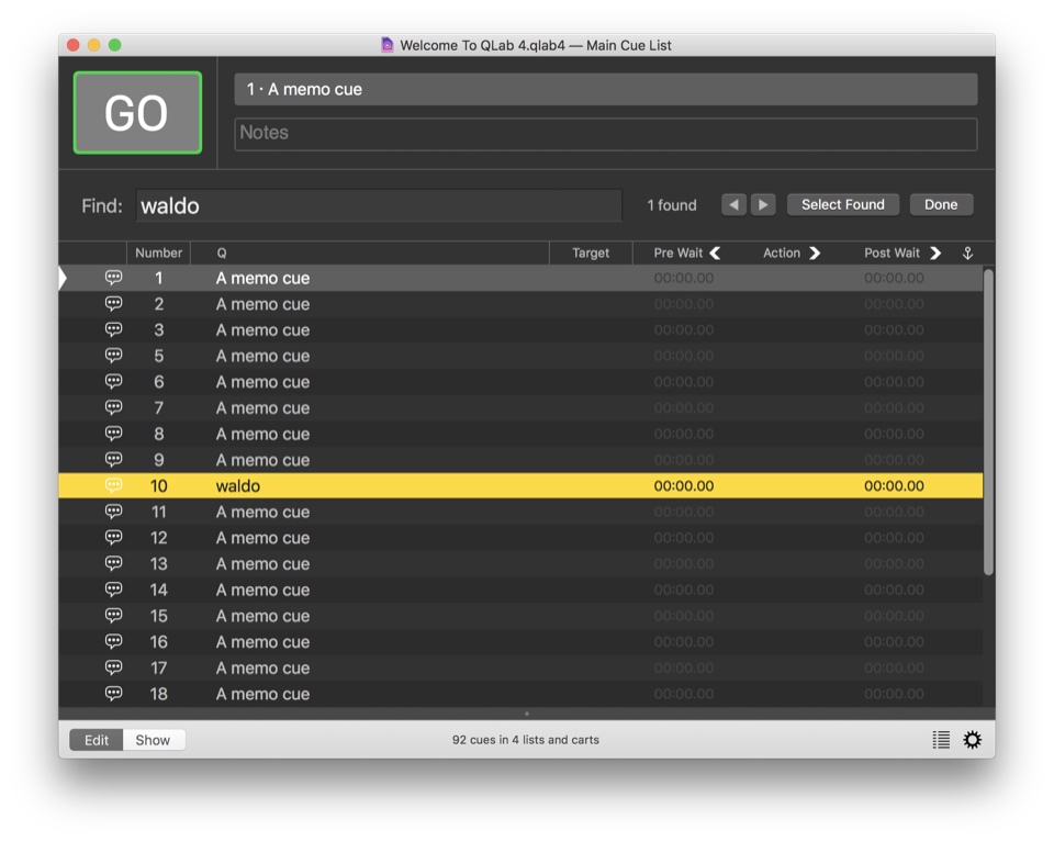You can search your workspace by selecting Find from the Edit menu in the toolbar, or by using the keyboard shortcut ⌘F. QLab will search cue names, cue numbers, the file names of Audio and Video cue targets, cue notes, the contents of Text cues, the contents of UDP messages, and the contents of Script cues. Searches are limited to one cue list or cue cart at a time.