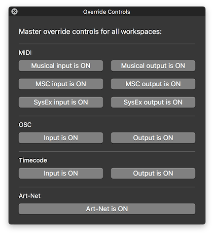The Override Controls window can be opened by choosing Override Controls from the Windows menu or by using the keyboard shortcut ⇧⌘O. This window provides a way to temporarily suspend input and output of various types of messages to and from QLab.