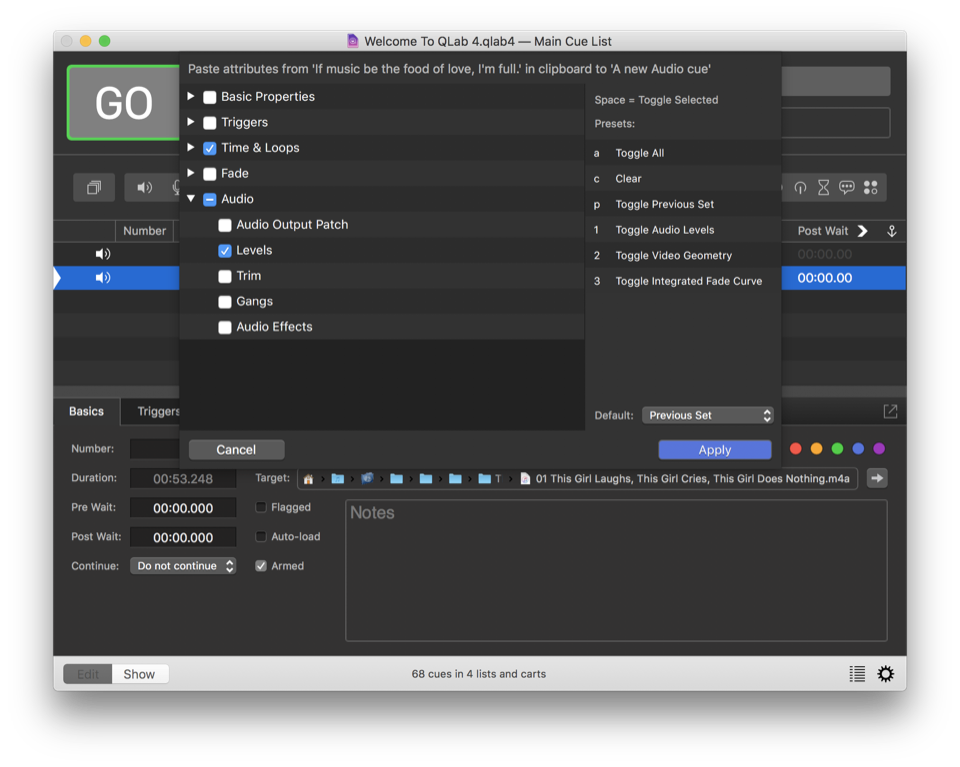 Hitting the enter key or clicking Apply will paste the selected properties onto the selected cue or cues. Hitting escape or clicking Cancel will close the sheet without making any changes.