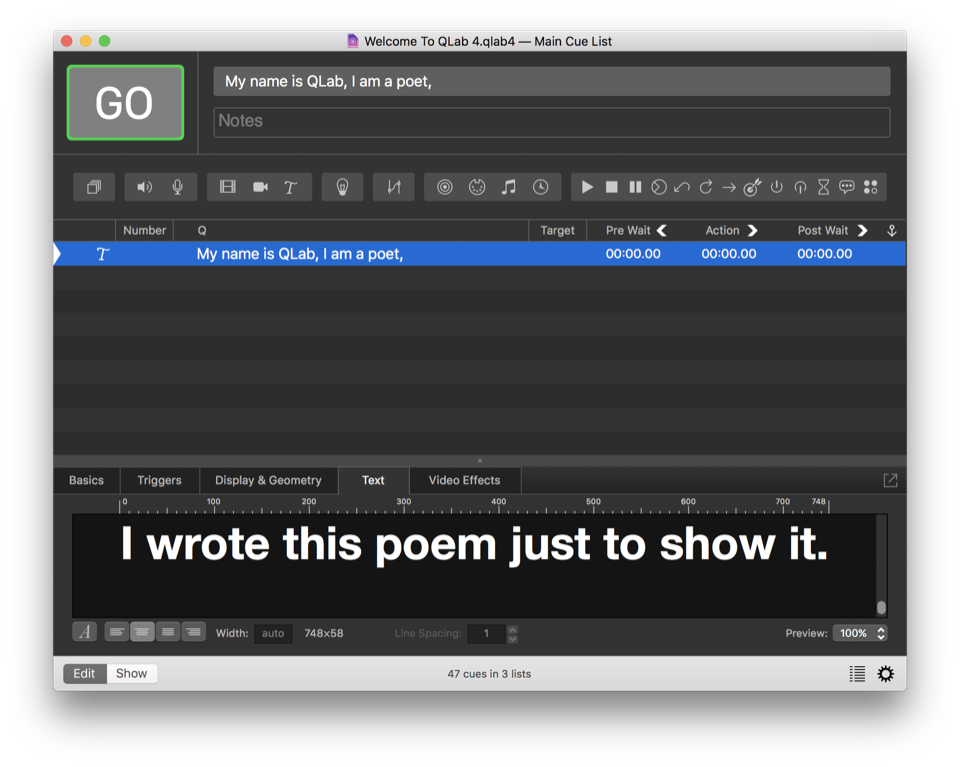 Text cues, which require a Pro Video or Pro Bundle license, allow you to display styled text in QLab, using any of the fonts installed on your Mac.