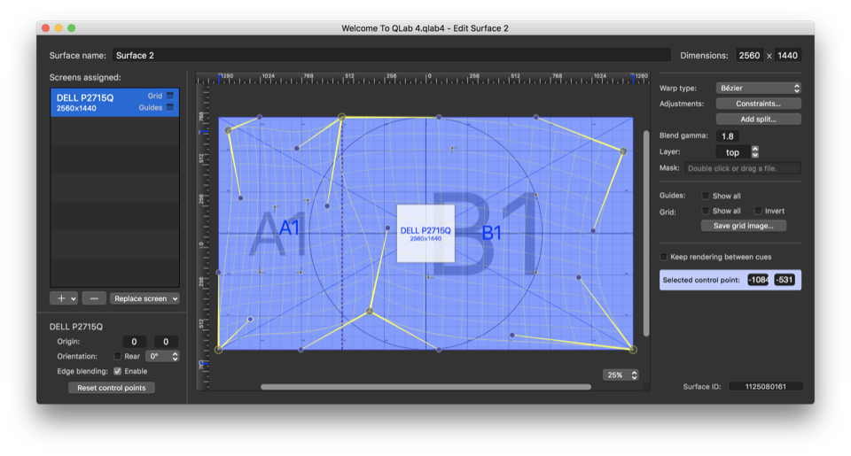 Whenever possible, QLab attempts to adjust control points automatically to match other changes you make to a surface, such as moving screens or changing the layout of splits. However, once control point adjustments have been made, it is generally not possible to interpolate correct new locations for the control points when the surface setup changes. Rather than wildly guessing in these cases (since manual adjustment will be necessary anyway,) QLab leaves the control points in place for you to adjust. This can cause the image to appear distorted until you fix the control points, because they no longer match closely with the area they represent.