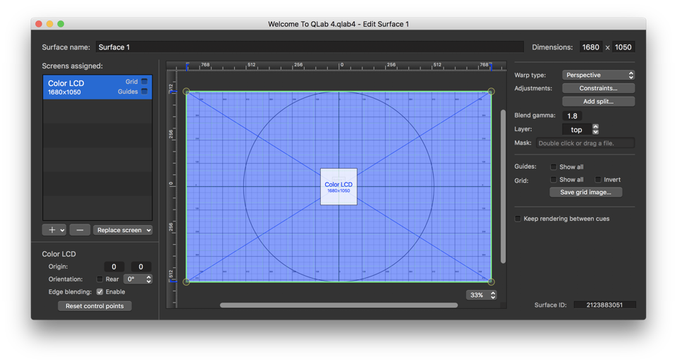 When you create a new workspace, QLab will automatically add a surface for each attached display, with that display assigned to the surface. That way, if you don’t need anything fancy you can start programming cues as quickly as possible. You can edit these surfaces to suit your needs, or you can delete them and create your own surfaces.